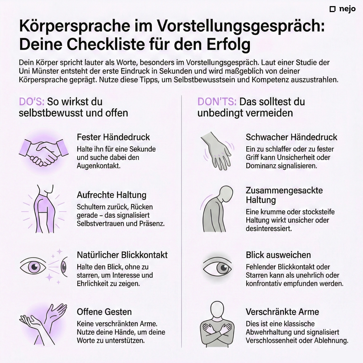 • Körpersprache entscheidet in Sekunden über den ersten Eindruck – fester Händedruck, Augenkontakt und offene Haltung signalisieren Selbstbewusstsein