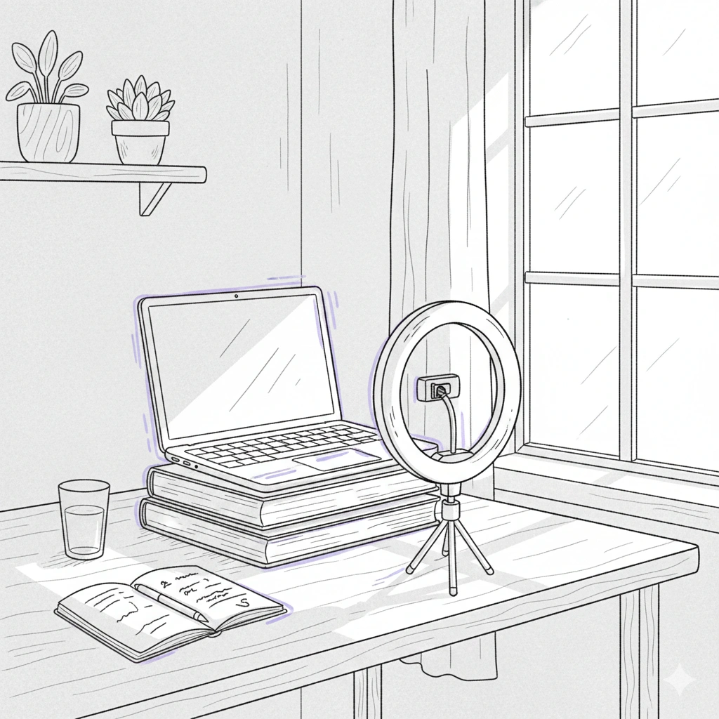 Licht von vorne, nicht von hinten. Ein Fenster hinter dir macht dich zur Silhouette. Ringlight oder Schreibtischlampe vor dir – das macht den Unterschied.