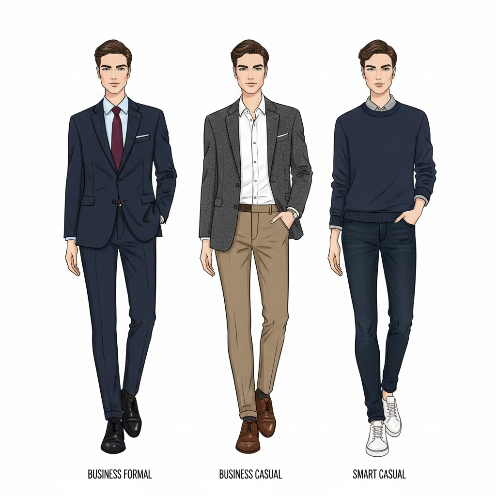 Infografik Dresscode-Stufen: Business Formal, Business Casual und Smart Casual im Überblick