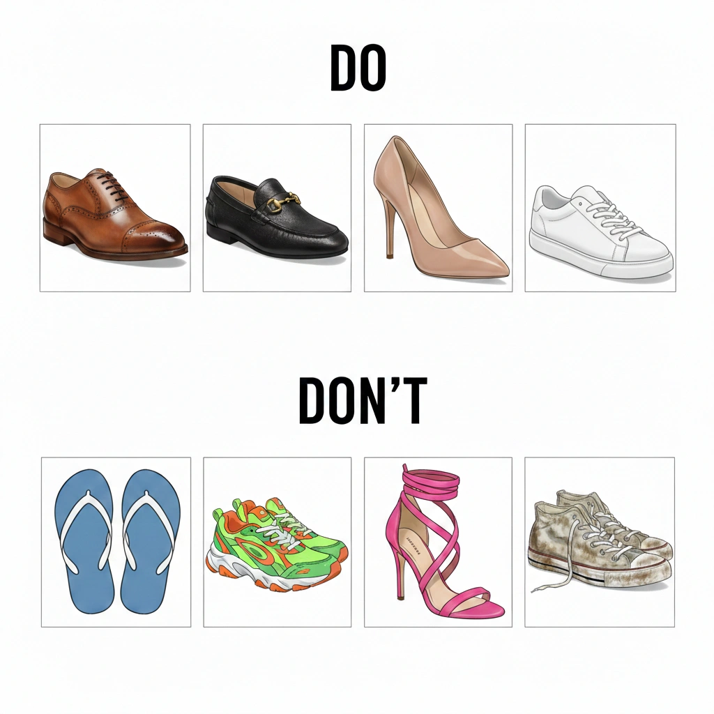 Geschlossene Schuhe sind die sichere Wahl. Der Absatz sollte 5-7 cm nicht überschreiten – du willst sicher und entspannt auftreten, nicht balancieren. Flache Schuhe sind völlig in Ordnung, solange sie gepflegt aussehen.