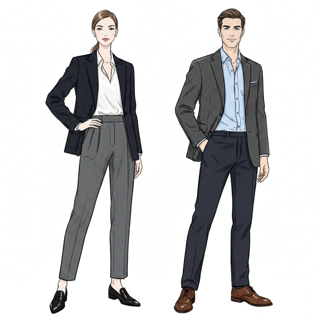 • Frauen: Stoffhose oder Rock, Bluse oder elegantes Top, Blazer, geschlossene Schuhe oder elegante Ballerinas